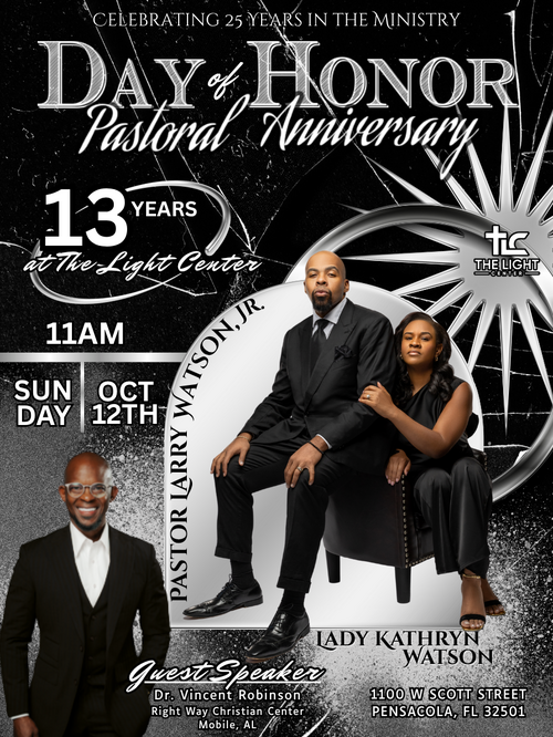 Join us for a momentous occasion as we honor Pastor Larry Watson, Jr. for 25 impactful years in ministry and 13 beautiful years as Pastor of The Light Center! Celebrate with us during the grand finale of our weekend at Pastoral Day of Honor Celebration on Sunday, October 12, 2025, at The Light Center's 11:00 AM Worship Service. We welcome Guest Speaker Dr. Vincent Robinson - Right Way Christian Center (Mobile, AL). Your Presence will make this celebration even more special as we recognize Pastor Larry Jr.'s unwavering dedication and service to our community. Don't miss out on this unforgettable event!